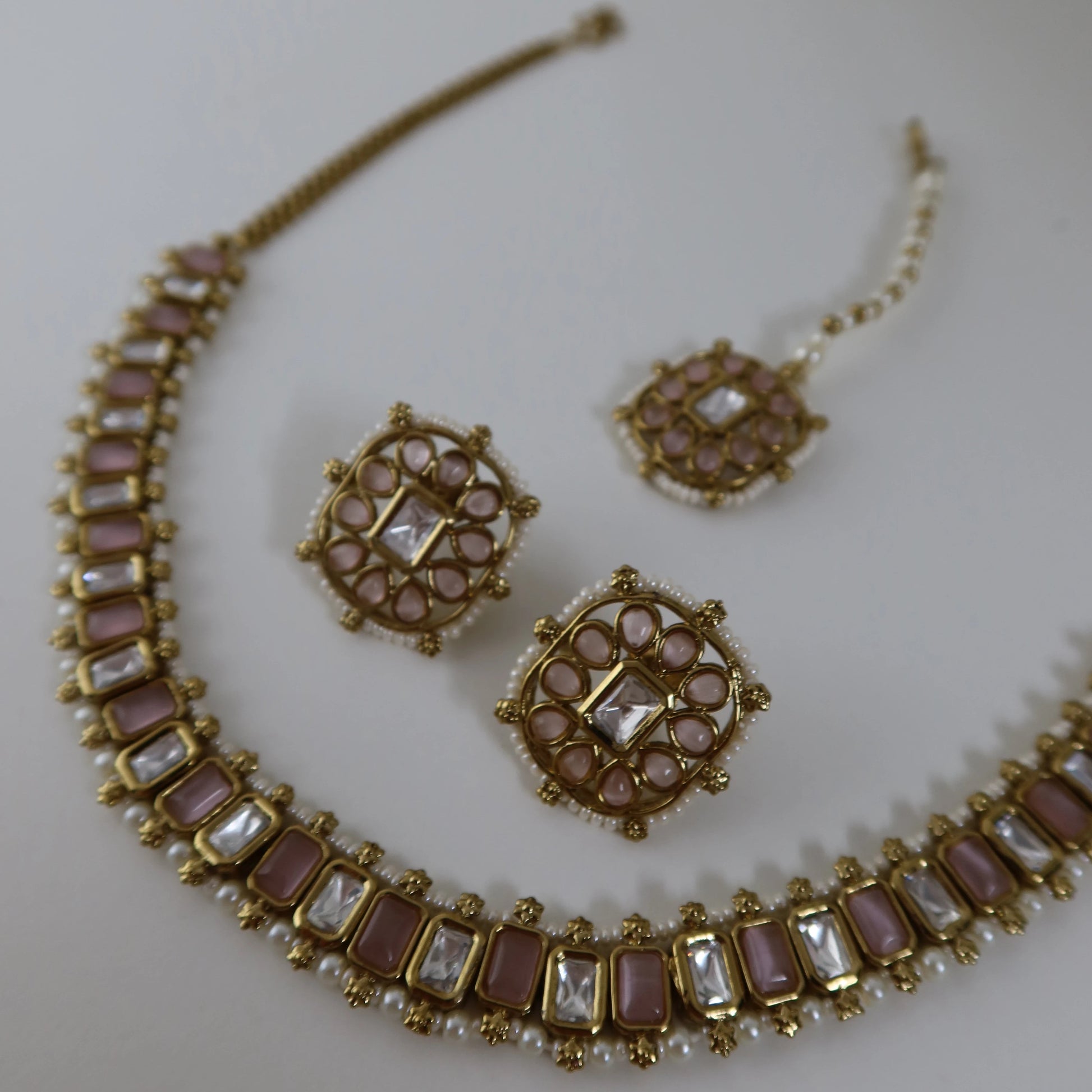 Handcrafted blush-pink kundan stones paired with champagne accents